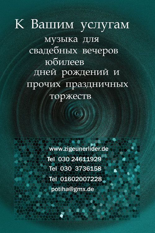 Impressum: Vadim Potikha, Bunzelweg 19c, 15566 Berlin, Tel: 03024611929, email: potiha@gmx.de